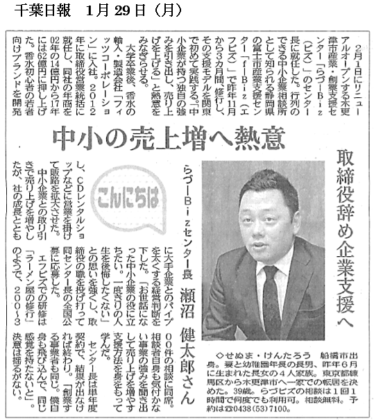 メディア掲載 2018.01.30 2025.08.03 『千葉日報』に掲載されました!【1月29日】 当センター・センター長が『千葉日報』に取り上げて頂きました。 「特に困っていなくても、何かのヒント、知恵出しができる。」 そんな『らづ-Biz』にリニューアルしていきます。 まずはお気軽に、来訪可能日時を教えてください! ご予約お待ちしております。