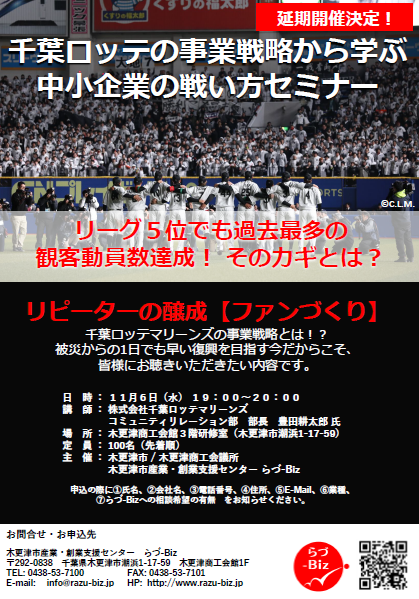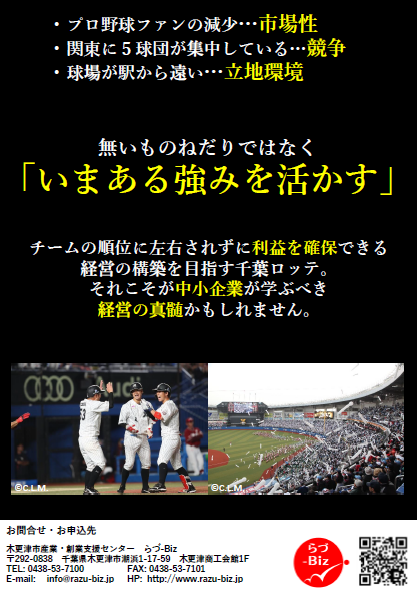 今回、らづ-Bizは、千葉ロッテマリーンズより コミュニティリレーション部 部長・豊田 耕太郎 氏 をお招きし、11/6(水)【千葉ロッテの事業戦略から学ぶ中小企業の戦い方セミナー】を開催致します。