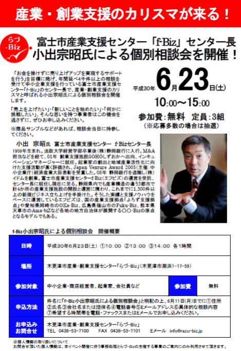 *「お金を掛けずに売り上げアップを実現するサポートを行う」を目標に掲げ、年間延べ4千件以上の相談を受けて中小企業支援を行っている富士市産業支援センター「f-Biz」のセンター長で、産業・創業支援のカリスマと呼ばれる小出宗昭氏による個別相談会を開催します。