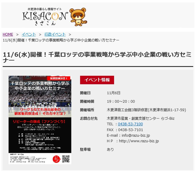 きさこんへのリンク→ http://kisacon.com/archives/event/116水開催%ef%bc%81千葉ロッテの事業戦略から学ぶ中小企/