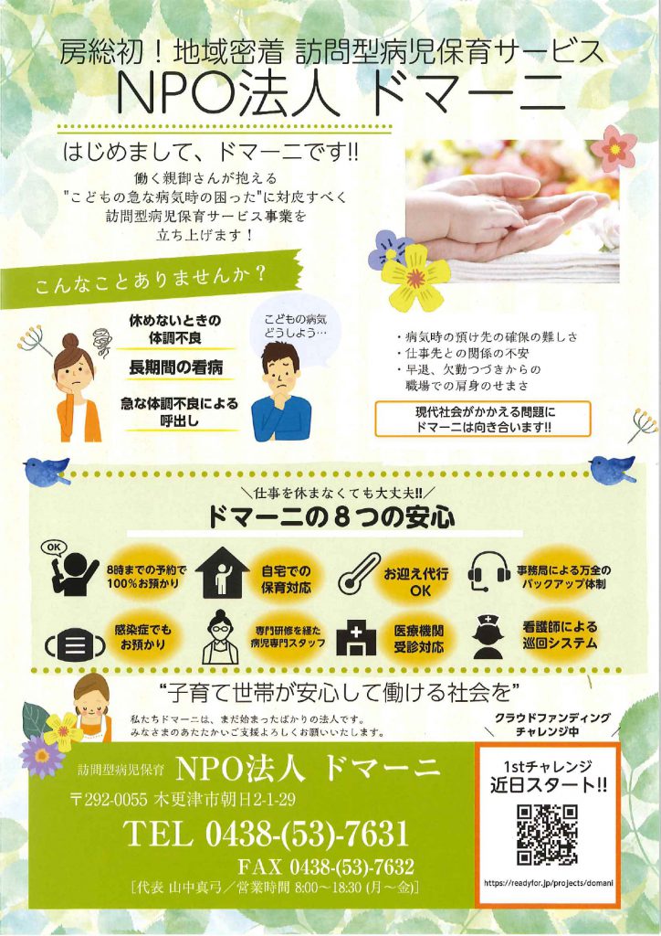 房総初!地域密着訪問型病児保育サービス『NPO法人 ドマーニ』が、10月よりサービススタートです!