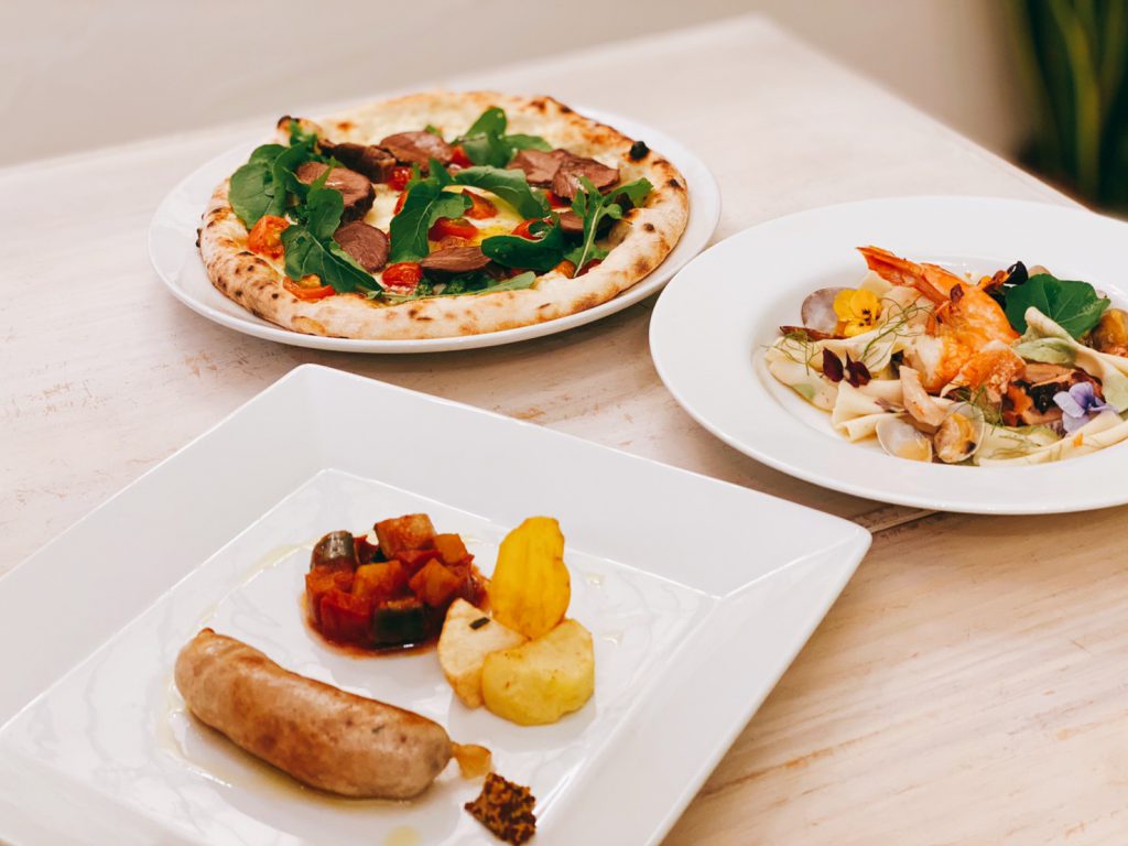 〇パスタ:魚介のソース エディブルフラワーを打ち込んだ自家製ファルファーレ(蝶々パスタ)