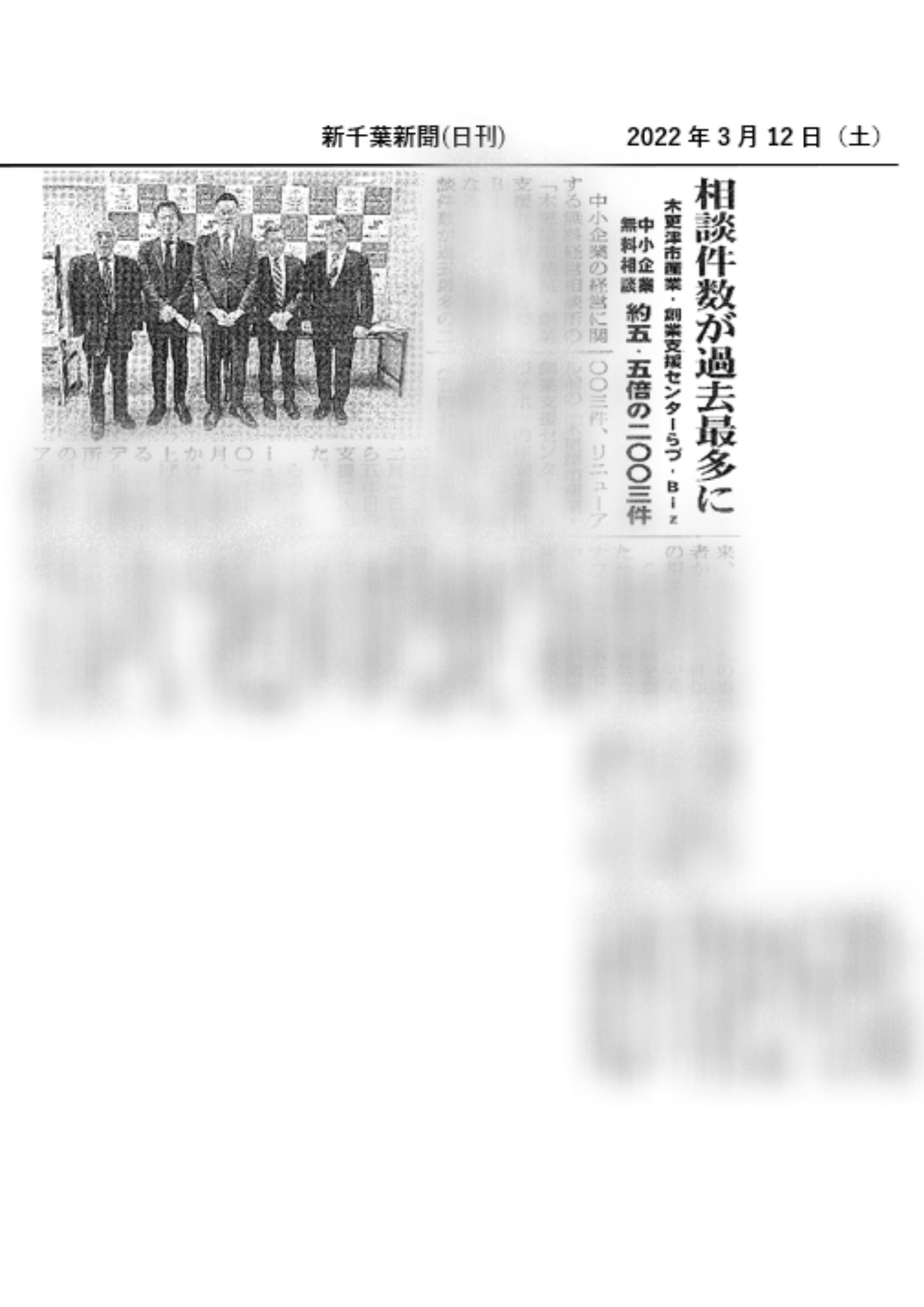 お知らせ 2022.03.14 2025.08.19 『らづBiz相談件数過去最多』について、新千葉新聞さんに掲載いただきました!【3月12日掲載】 『らづBiz相談件数過去最多』について、新千葉新聞さんに掲載いただきました。 > 相談件数が過去最多に 木更津市産業・創業支援センターらづBiz 中小企業無料相談 約5.5倍の2003件