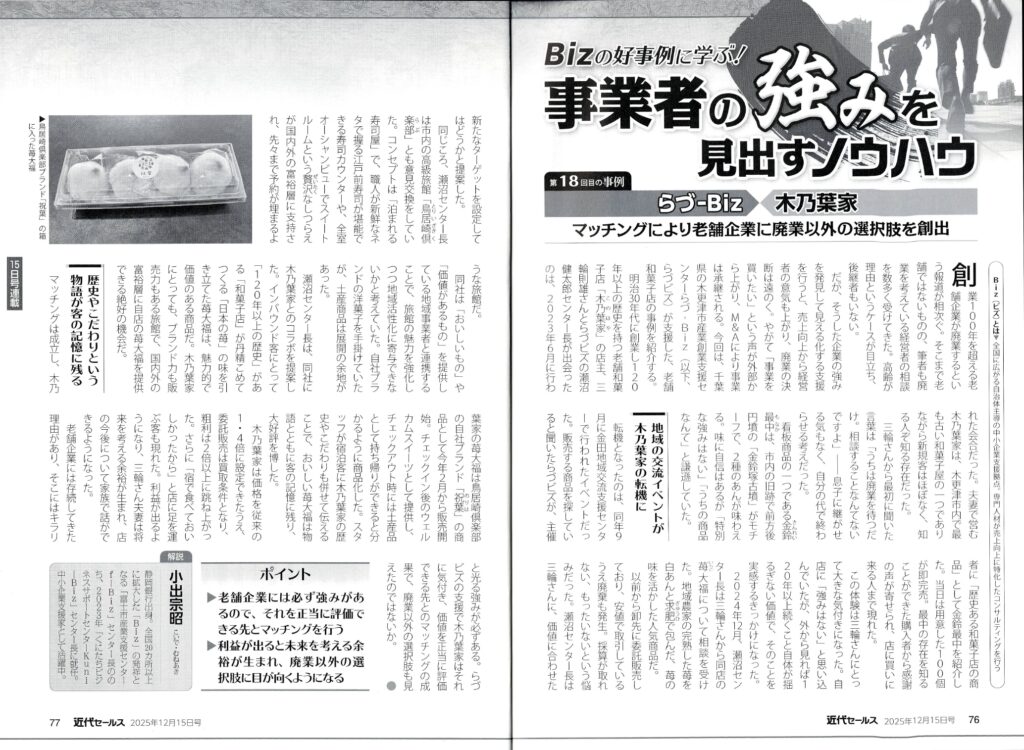 メディア掲載 2025.12.15 【木乃葉家 様】近代セールス 12月15日号 掲載 近代セールス 2025年12月15日号『Bizの好事例に学ぶ!事業者の強みを見出すノウハウ』で、らづビズがサポートした木乃葉家 様について取り上げていただきました。 > マッチングにより老舗企業に廃業以外の選択肢を創出 近代セールス社|ウェブサイト