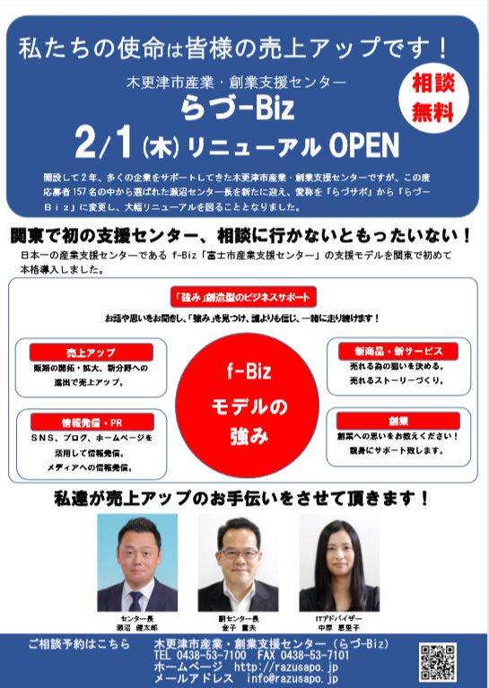 2月1日(木)~リニューアルオープンする『らづ-Biz』では、リニューアル後の相談予約の受付を
