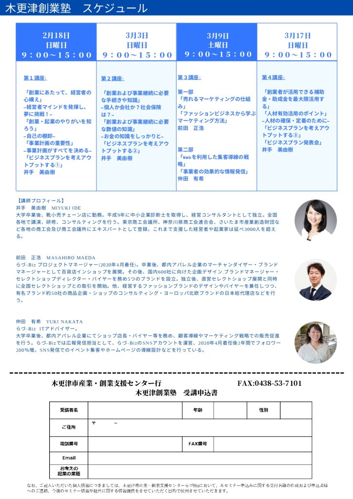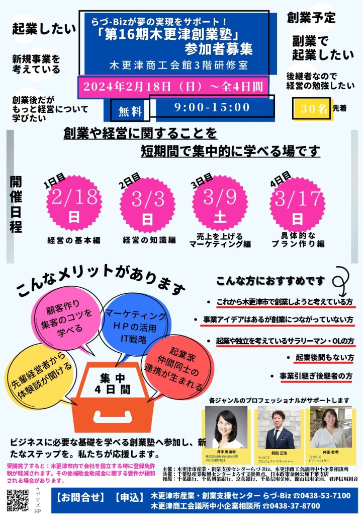 【締め切りました】「第16期木更津創業塾」2月18日(日)より開催!